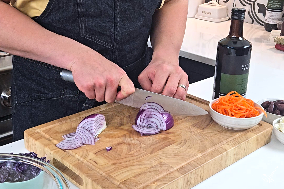 Shred the cabbage and place it in a large bowl with the onion and carrot.