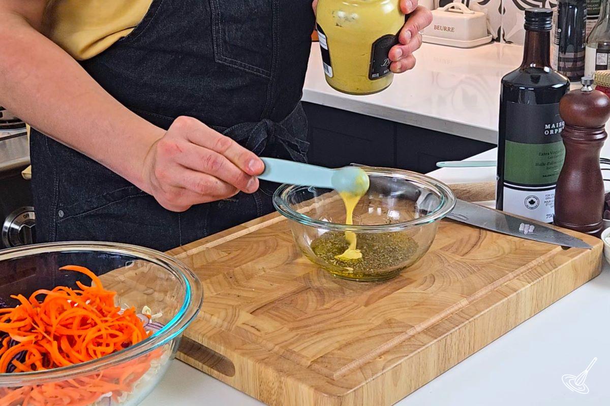 Combine all of the dressing ingredients in a small bowl and whisk until smooth.