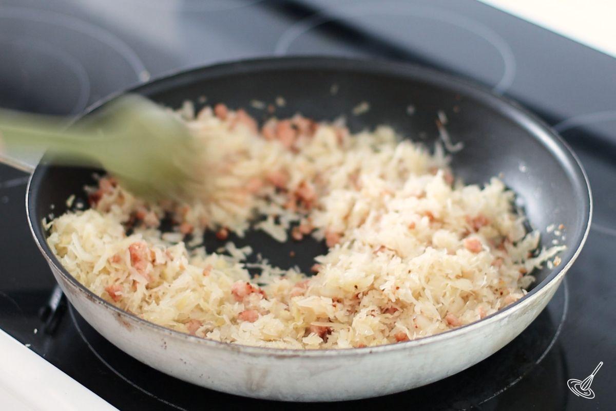 - Rince the sauerkraut and squeeze out any excess liquid from it. Chop it finely and then add to the pan with the cooked bacon and onions.