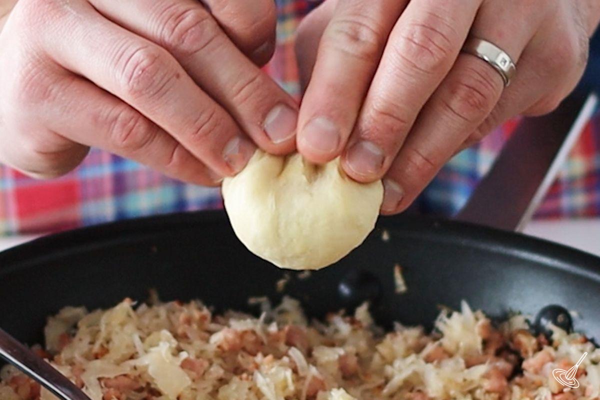 - Use your finger to flatten out each piece of dough into a 3 ½ inch disk. Hold the disk in one hand and use a spoon to place 2-3 tablespoon of the cabbage filling in the centre of the disk.
