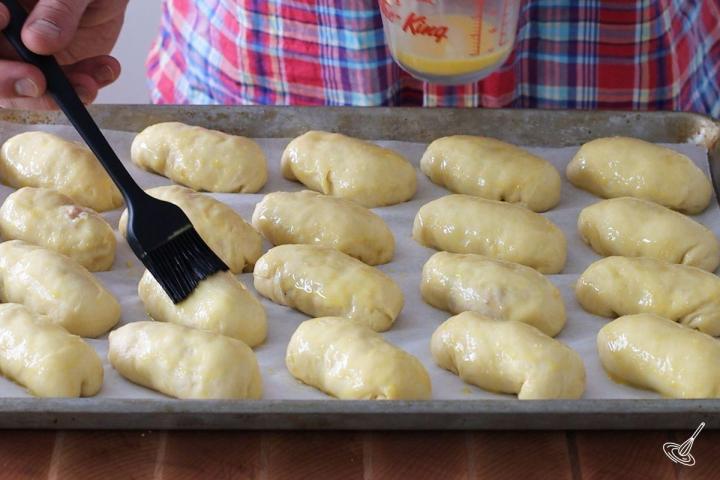 - Make the egg wash by mixing together the yolk and the milk. Brush each Pyrizhky with the egg wash. Bake in the preheated oven for 20-25 minutes or lightly golden.