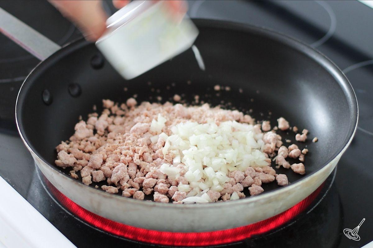 - Make the filling by cooking the chopped bacon and the onions over medium heat. Take the cooked bacon and onion mixture off the heat.