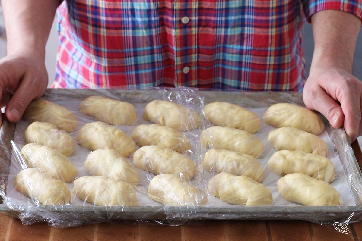 - Place the shaped Pyrizhky, seam down, on a parchment paper lined baking tray. Cover with a plastic wrap and proof for 1 hour, or until doubled.