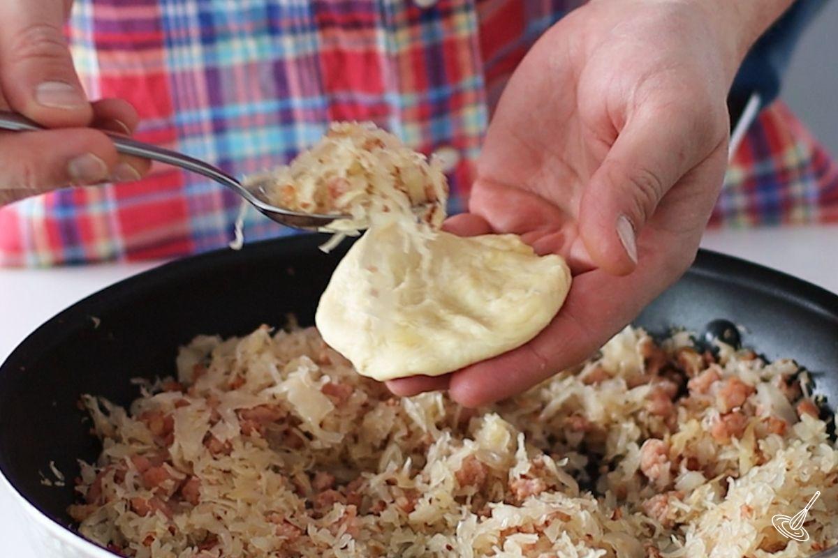 - Use your finger to flatten out each piece of dough into a 3 ½ inch disk. Hold the disk in one hand and use a spoon to place 2-3 tablespoon of the cabbage filling in the centre of the disk.