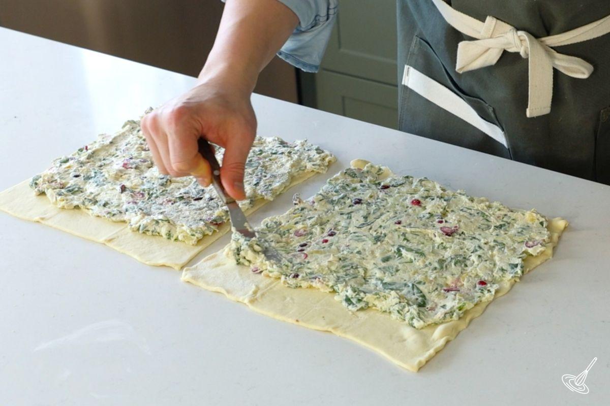 - Lay down the two 10"x10" squares of puff pastry on a clean surface. Divide the filling mixture between the two pastries. Spread the filling evenly, leaving a 1-inch gap at the top, furthest from you.