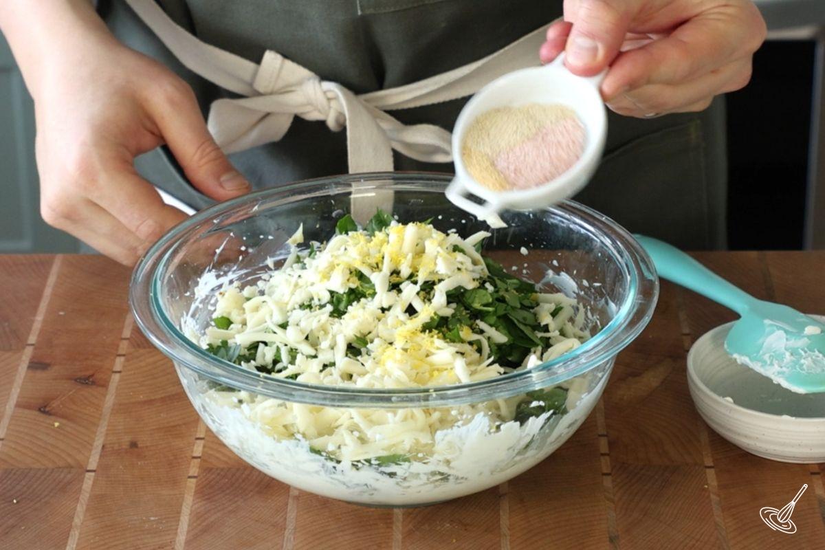 - Add to the cream cheese mixture, the spinach, artichokes, garlic powder, onion powder, salt, lemon zest, cranberries, and mozzarella. Mix until well combined.1 teaspoon Onion Powder, ½ teaspoon Garlic Powder, ½ teaspoon Salt, 1 teaspoon Lemon Zest, 1 cup Mozzarella, 2 cups Fresh Spinach, 1 cup Canned Artichoke Hearts, ½ cup Fresh Cranberries
