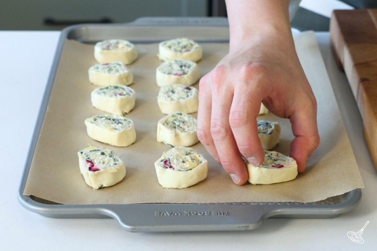 - Cut each roll into twenty, ½ inch pinwheels. Place 20 cut pieces onto a parchment paper lined baking tray. Repeat with the other roll.