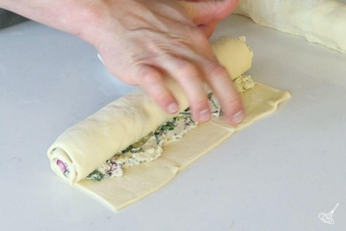 - Roll-up each square, rolling away from you, making sure it's not too loose. Moisten the exposed dough with a little water to help seal up the pinwheel. Use your fingers to pinch the rolls shut.