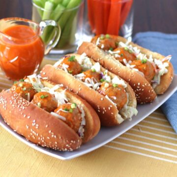 This meatball recipe can be used as an appetizer, simply by coating the cooked meatballs in the ½ cup of buffalo sauce and serving them by themselves. If you are not a fan of blue cheese, you can replace the dressing with Ranch of even Caesar salad dressing.